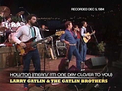 Photograph of The Gatlin Brothers standing together on stage at Austin City Limits (ACL). The man on the left is smiling and waving, two men, identified as Steve and Larry, are visible in the middle smiling, the man on the right, identified as Rudy, has a guitar hanging in front of him and has his arms out, and another man is visible standing behind the group and smiling.